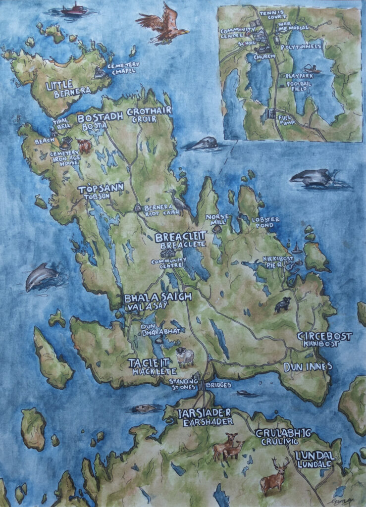 The Museum (located in the Community Centre in Breaclete) is run by the Bernera Historical Society, who promote and sustain the identity and cultural heritage of Bernera and Tir Mor through collecting, recording, conserving and curating evidence of the history and culture of the area and its people.